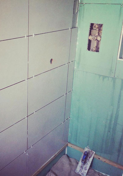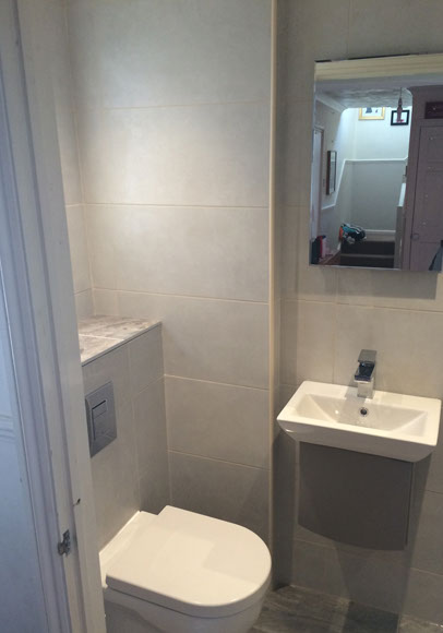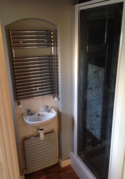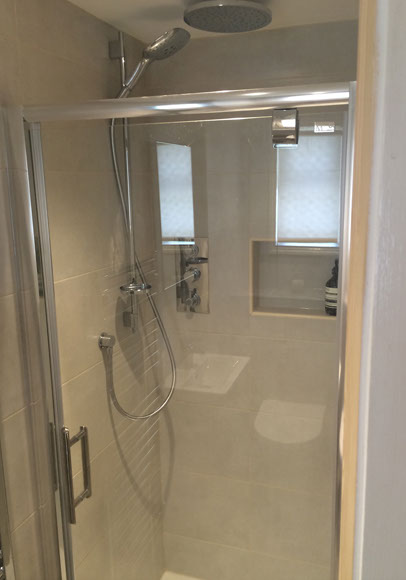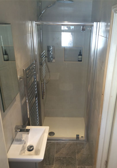 This is a downstairs shower room with little space. It backs onto the garage so during winter months there is a lot of condensation that builds up in the room. So we made sure our design included better wall insulation and a strand extractor fan. The shower room also backed onto a utility room, so we thought it would work well to extend the back wall into the utility room, giving the shower area an extra meter of space and allowing for a larger shower tray. Also with the right tile it can help give the illusion of a larger room.